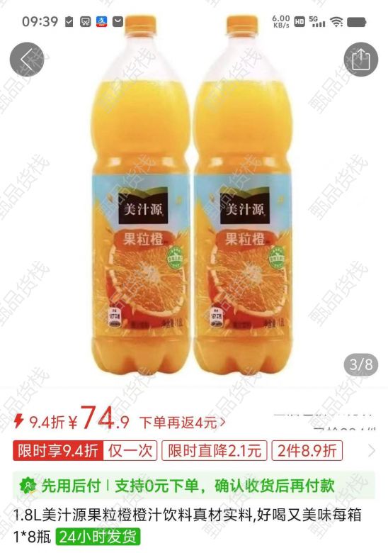 甄品货栈> 佰辰优选团购总仓> 1月1.8L✘8瓶美汁源果粒橙